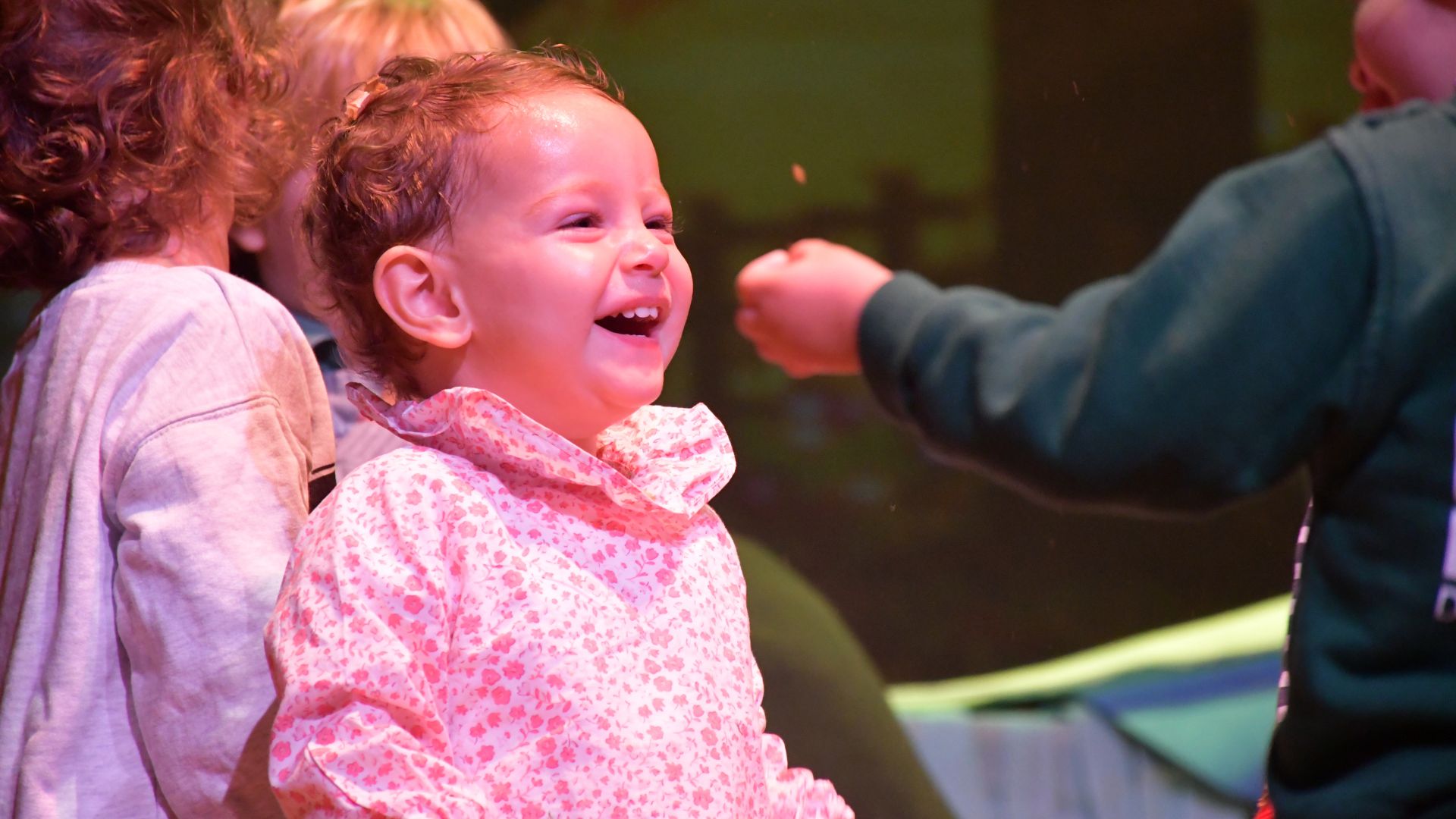 Sus profesoras, prepararon cada detalle de los que adornaban el escenario del teatro Fernández-Baldor para que los niños pudieran experimentar con los diferentes materiales allí expuestos: peluches, hojas de otoño, piñas, aire, agua…todo para apelar a la estación del otoño, sus colores, sonidos y frutos del momento.