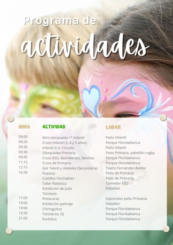 De 9:00 h hasta las 00:00 compartiremos muchos momentos de diversión con alumnos, familias, amigos y personal del centro. No olvides reservar el 29 de mayo en tu agenda.